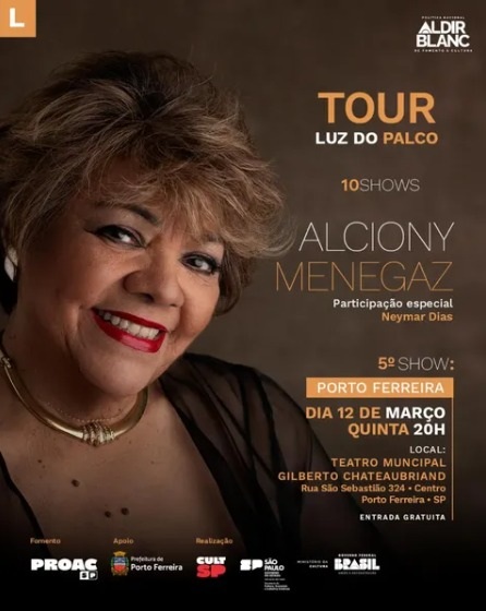 Porto Ferreira vai receber uma noite de muita música e emoção com a tour da cantora Alciony Menegaz. O espetáculo acontece no Teatro Municipal Gilberto Chateaubriand, localizado na Rua São Sebastião, 324, no centro da cidade, e traz canções inéditas do novo álbum, além de clássicos da música brasileira.