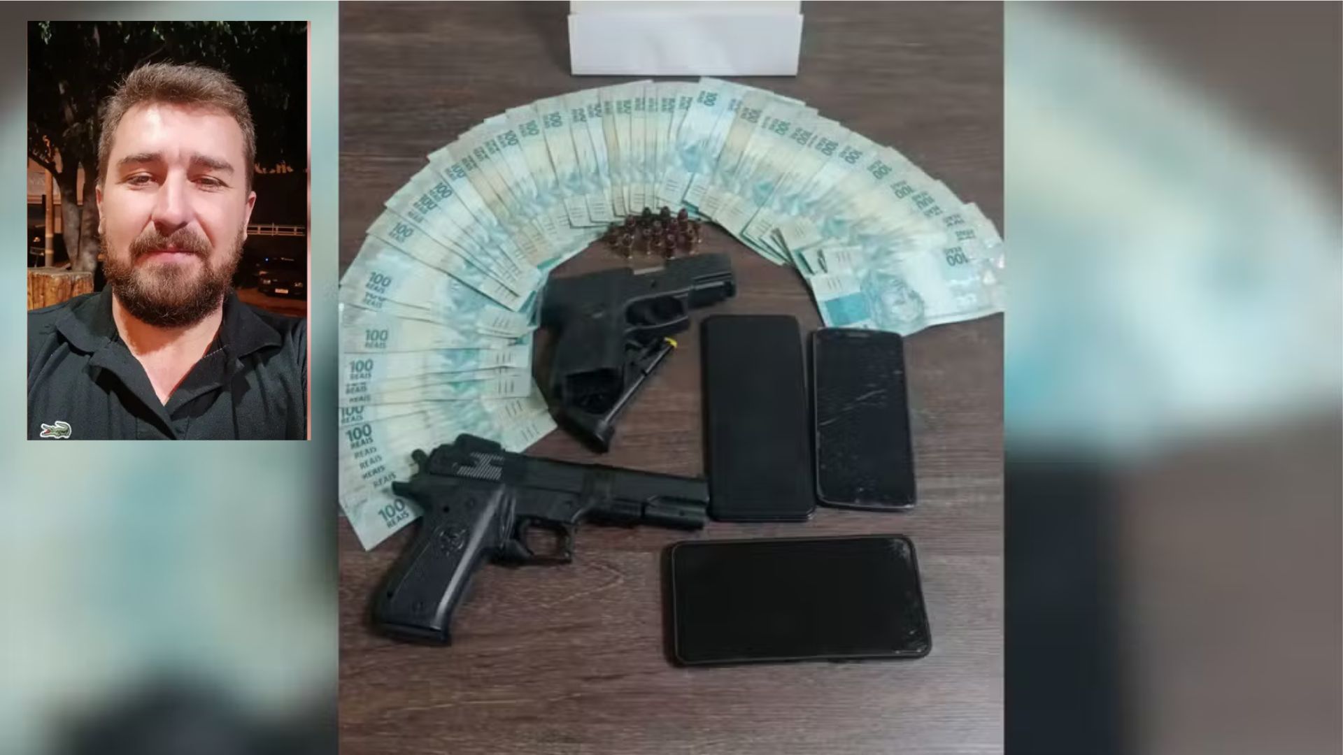 O encontro para a entrega do dinheiro foi marcado no prédio da prefeitura. No horário combinado, os policiais abordaram o suspeito e encontraram a quantia com ele. Também foram apreendidos um celular e uma pistola calibre 9mm. Na caminhonete do investigado, estacionada em frente ao local, os agentes localizaram mais dois celulares e um simulacro de arma de fogo.