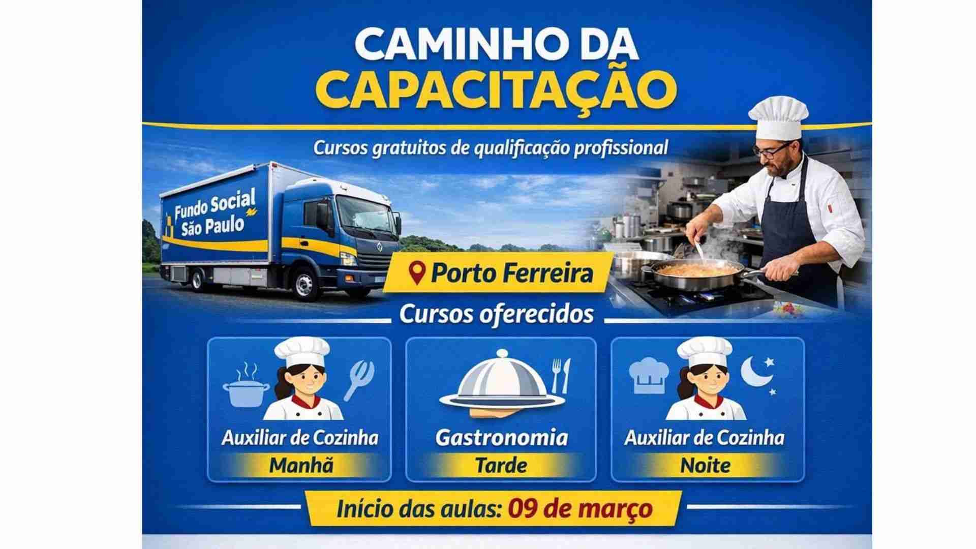 O município de Porto Ferreira (SP) recebe, a partir deste domingo (9), cursos gratuitos de qualificação profissional por meio do programa Caminho da Capacitação, iniciativa do Fundo Social de Solidariedade do Estado de São Paulo voltada à formação profissional e incentivo à geração de renda.