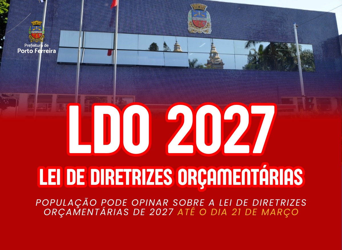 A Prefeitura de Porto Ferreira, por meio da Secretaria de Fazenda e Planejamento, informa que está disponível até o dia 21 de março (sábado) o questionário para participação da população com propostas para elaboração da LDO (Lei de Diretrizes Orçamentárias) para o exercício de 2027.