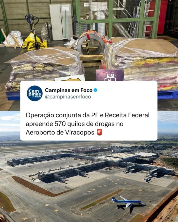 Uma operação conjunta da Polícia Federal e da Receita Federal resultou na apreensão de aproximadamente 570 quilos de cocaína na sexta-feira (6), no Aeroporto Internacional de Viracopos, em Campinas.