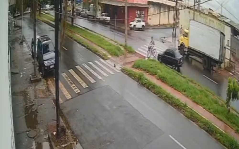 O acidente ocorreu por volta das 13h e foi registrado por câmeras de segurança. Nas imagens, o homem aparece atravessando a avenida com a bicicleta e, quando chegava próximo ao canteiro central, é atingido pelo veículo.
