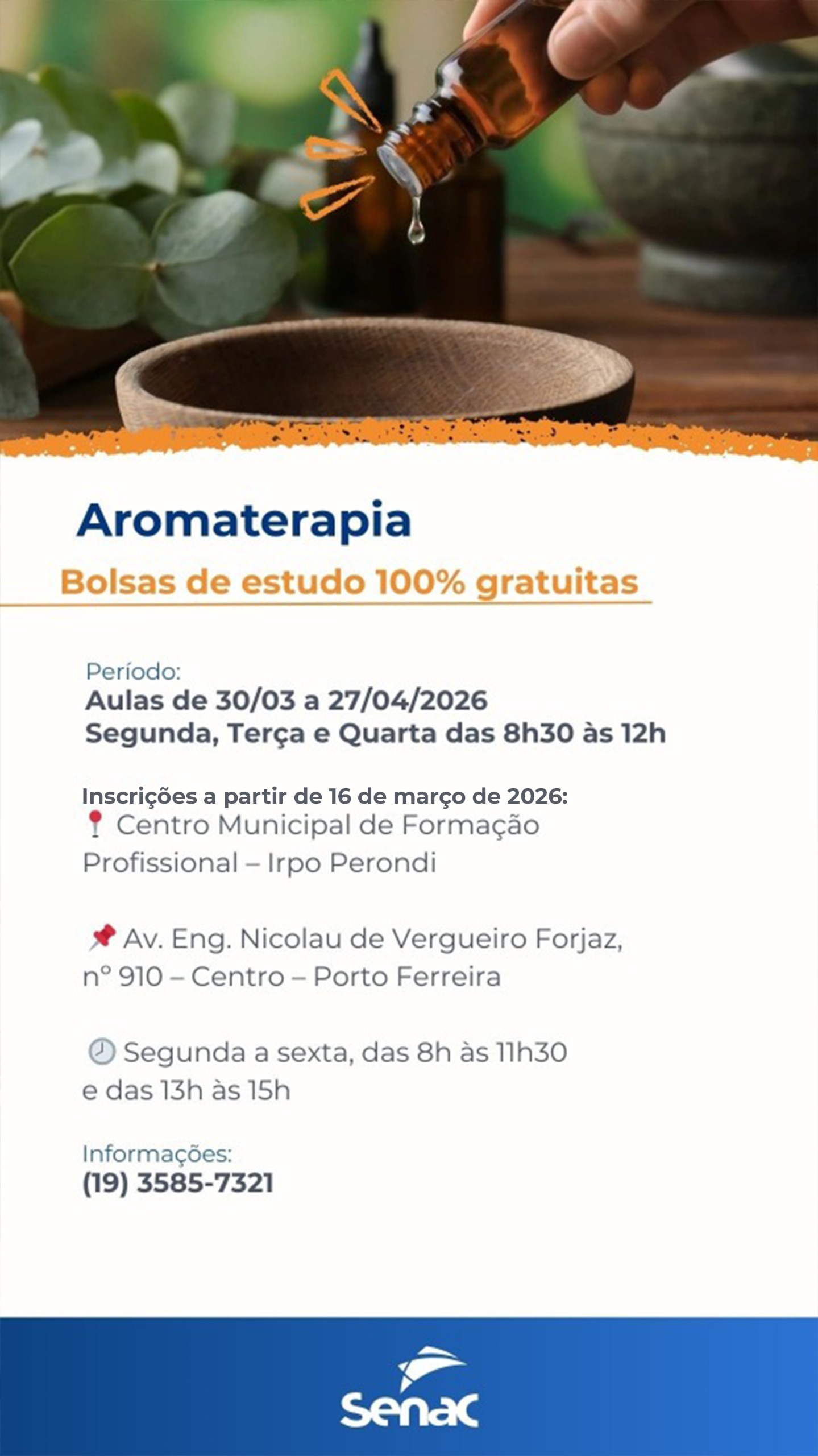 A Prefeitura de Porto Ferreira abriu inscrições para um curso gratuito de aromaterapia, realizado em parceria com o Senac. A iniciativa oferece bolsas de estudo integrais e busca ampliar as oportunidades de qualificação profissional para a população.