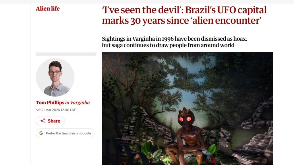 A cidade de Varginha voltou ao centro das atenções internacionais após uma reportagem do jornal britânico The Guardian destacar o crescimento do turismo ufológico no município. O conteúdo aponta a cidade como um dos principais destinos do mundo para interessados em fenômenos extraterrestres, impulsionada pela história do chamado “ET de Varginha”.