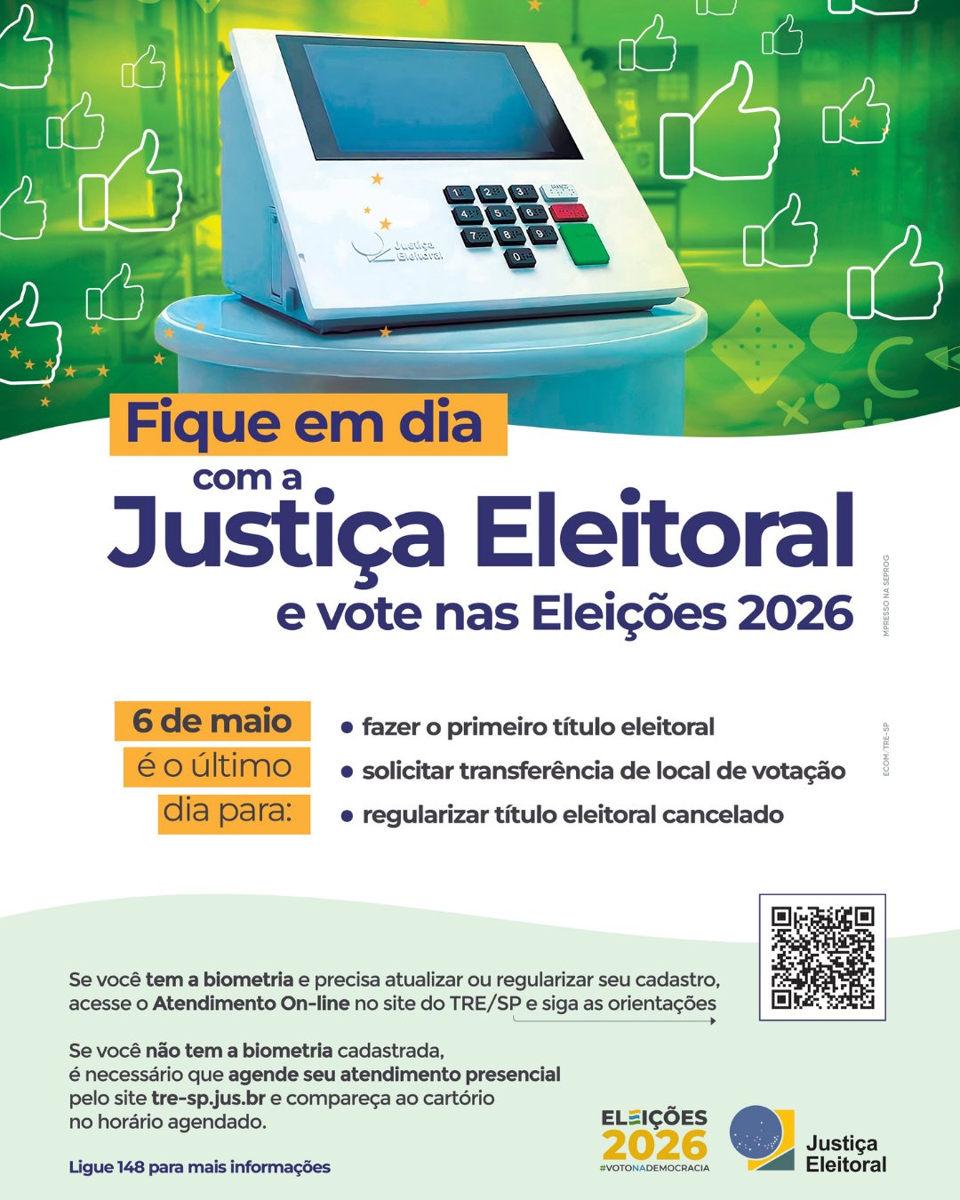 Eleitoras e eleitores têm até o dia 6 de maio para emitir o primeiro título, regularizar pendências ou atualizar dados para votar nas eleições de 2026. Após esse prazo, o cadastro será fechado pela Justiça Eleitoral para organização do pleito.