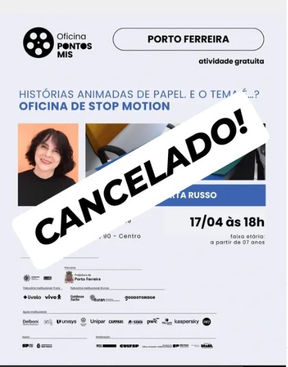 A oficina “Histórias animadas de papel. E o tema é…? Oficina de stop motion”, que aconteceria nesta sexta-feira, foi cancelada. A informação foi divulgada pela organização do evento, que apontou questões relacionadas à empresa da oficineira como motivo da suspensão da atividade.