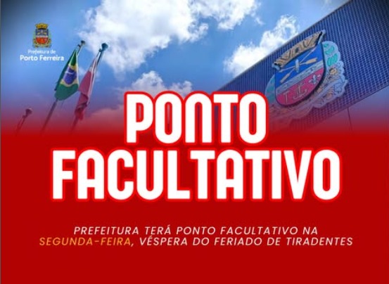 A Prefeitura de Porto Ferreira informou que as repartições públicas municipais terão ponto facultativo na próxima segunda-feira, 20 de abril, em razão do feriado nacional de Tiradentes, celebrado na terça-feira, dia 21.