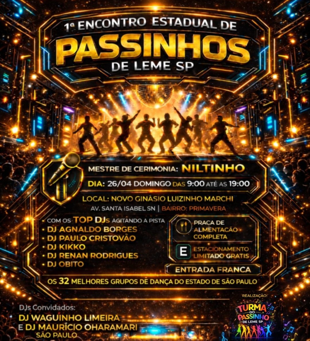 A cidade de Leme será palco, neste domingo (26), do 1º Encontro Estadual de Passinhos, evento que promete reunir dança, música e muita animação ao longo de todo o dia. A programação acontece das 9h às 19h, no novo Ginásio Luizinho Marchi, com entrada gratuita para o público.
