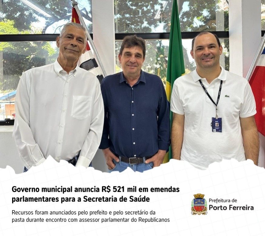 A Secretaria de Saúde de Porto Ferreira receberá um total de R$ 521 mil em emendas parlamentares. O anúncio foi feito na última quarta-feira (22) pelo prefeito André Braga e pelo secretário de Saúde, Dr. Pedro Melo, durante reunião realizada na Prefeitura com o assessor parlamentar do Republicanos, Paulo Aurelietti.
