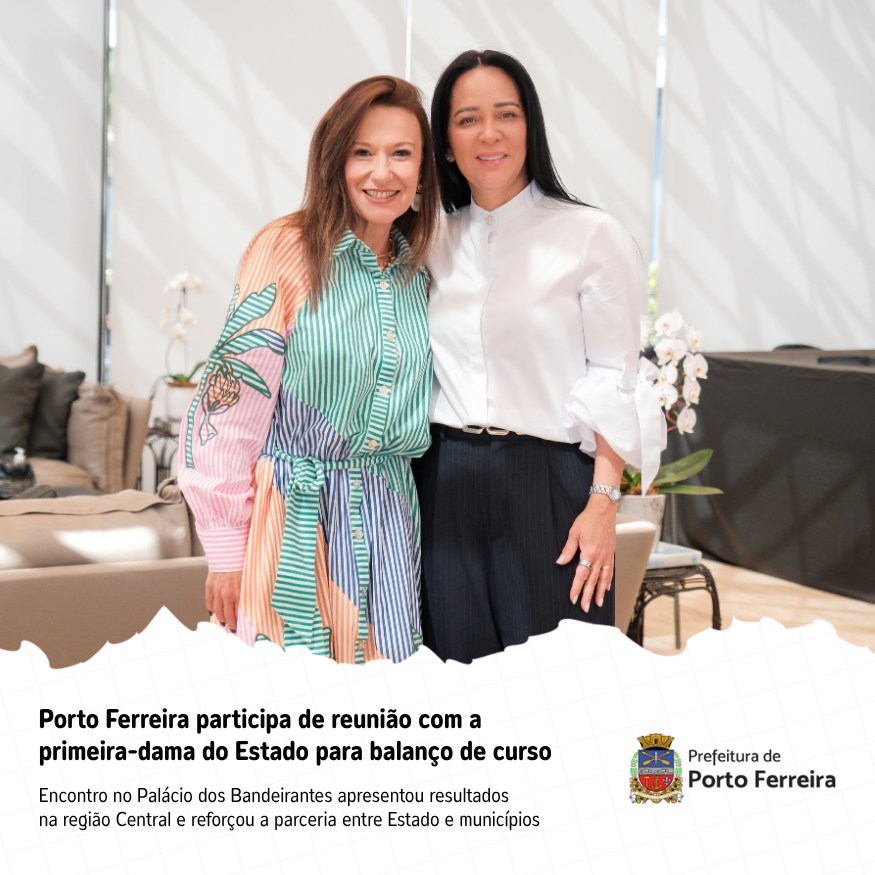 A primeira-dama do Estado e presidente do Fundo Social de São Paulo, Cristiane Freitas, participou na última quinta-feira (23), no Palácio dos Bandeirantes, do encerramento do 17º ciclo do Caminho da Capacitação. O encontro reuniu a primeira-dama de Porto Ferreira e secretária de Desenvolvimento Social e Cidadania, Ana Carolina Diniz da Cunha Cintra Braga, além de representantes de outros municípios da região Central.