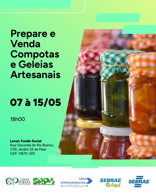 Uma oportunidade para quem deseja aprender ou aprimorar habilidades na produção de alimentos artesanais será realizada em Santa Rita do Passa Quatro. O curso “Prepare e venda compotas e geleias artesanais” promete ensinar desde técnicas de preparo até estratégias de comercialização, ajudando os participantes a desenvolver produtos de qualidade e conquistar espaço no mercado.
