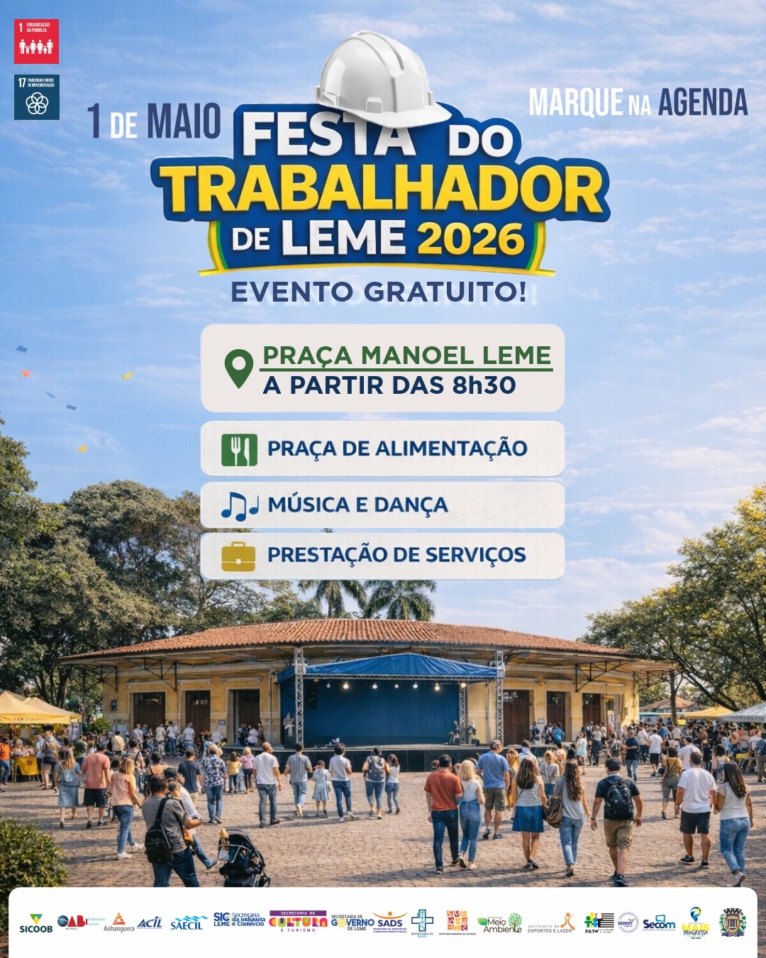 A Prefeitura de Leme promove, na próxima sexta-feira, 1º de maio, a Festa do Trabalhador 2026. O evento acontece das 8h30 às 16h, na Praça Manoel Leme, antiga FEPASA, reunindo uma programação diversificada em comemoração ao Dia do Trabalho.