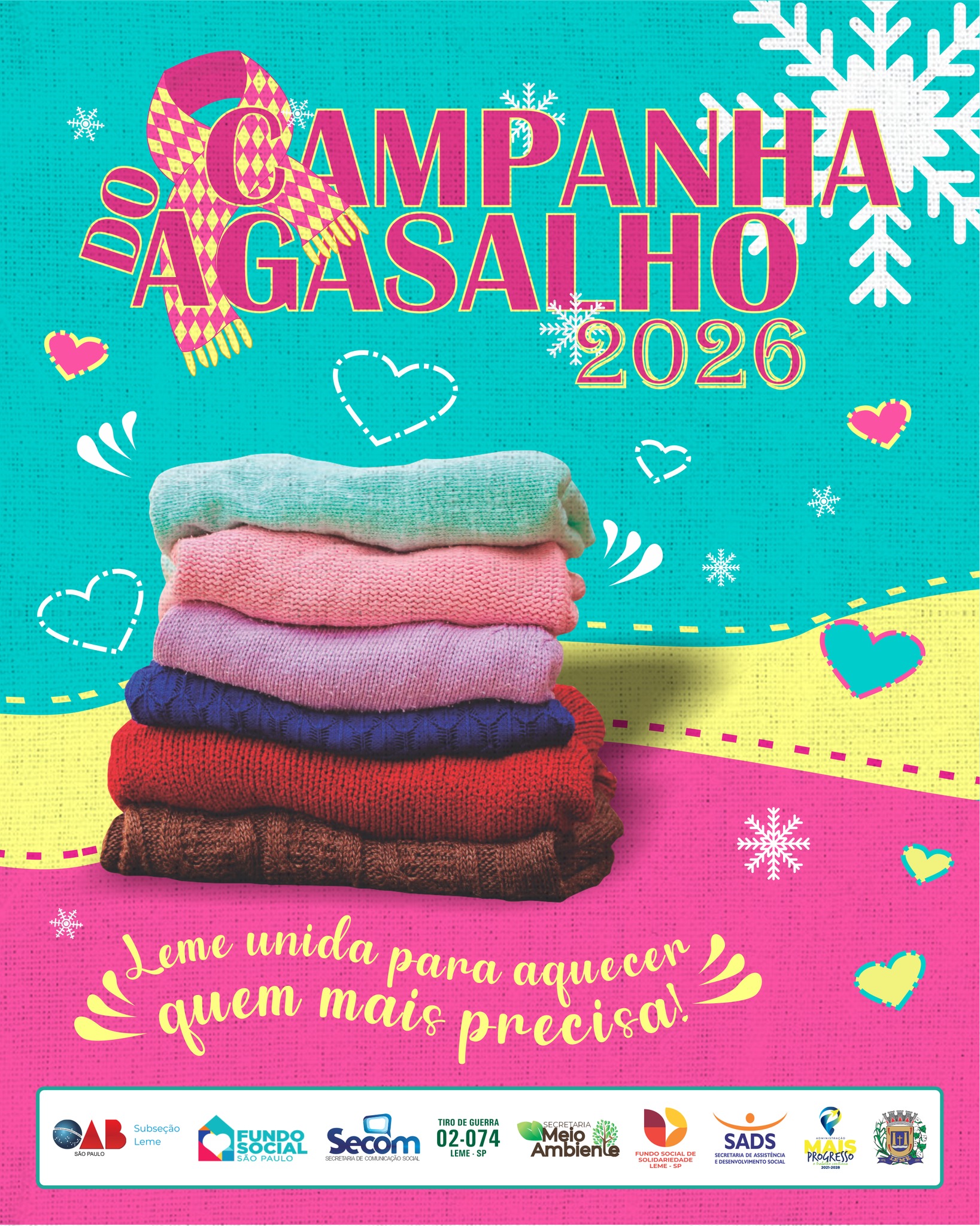 A Prefeitura de Leme divulgou o cronograma da Campanha do Agasalho 2026, organizada pela Secretaria de Assistência e Desenvolvimento Social em parceria com o Fundo Social de Solidariedade, Secretaria do Meio Ambiente, OAB Subseção Leme e o Tiro de Guerra 02/074.