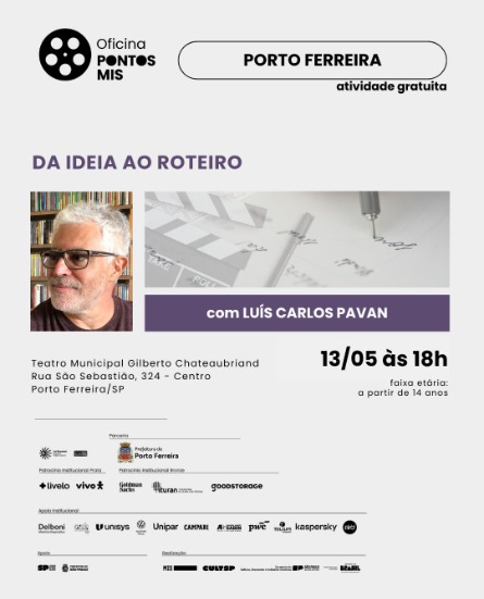 Quem tem interesse por cinema, escrita e criação de histórias já pode se programar para uma oportunidade cultural gratuita em Porto Ferreira. A oficina “Da Ideia ao Roteiro” será realizada no dia 13 de maio, das 18h às 22h, no Teatro Municipal Gilberto Chateaubriand, localizado na Rua São Sebastião, 324, no Centro.