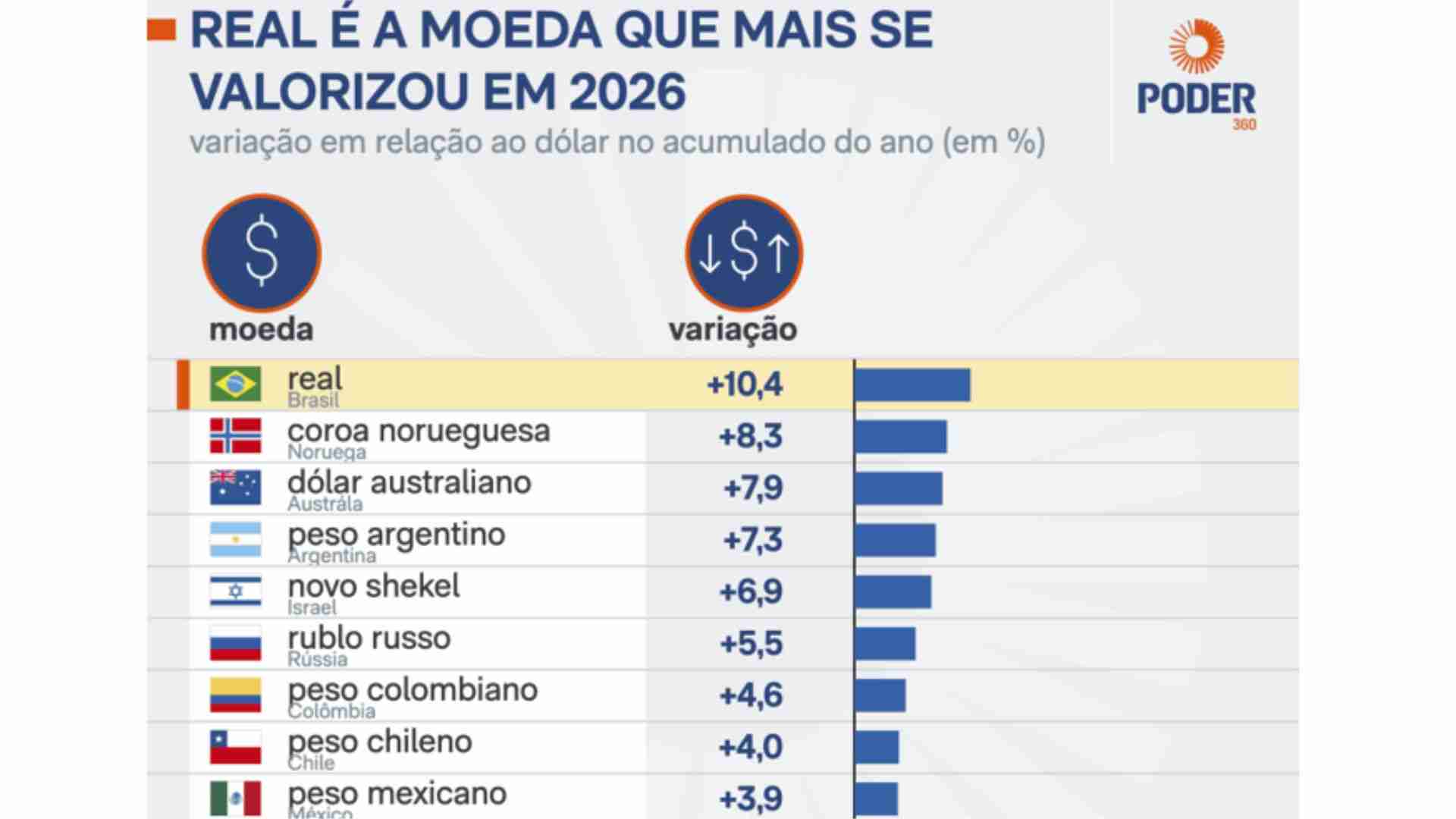O real vive um momento de raro otimismo no mercado cambial em 2026. Levantamento que acompanhou o desempenho de 27 moedas ao redor do mundo, aponta que a moeda brasileira registrou a maior valorização frente ao dólar no acumulado do ano, com alta superior a 10%. Na última sexta-feira a moeda estadunidense era cotada a menos de R$ 5 por dólar.