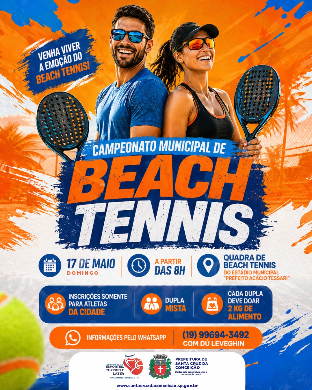 Santa Cruz da Conceição se prepara para receber o Campeonato Municipal de Beach Tennis, marcado para o dia 17 de maio, domingo, a partir das 8h. A competição será realizada na quadra de beach tennis do Estádio Municipal “Prefeito Acácio Tessari” e promete reunir atletas da cidade em um dia de esporte e integração.