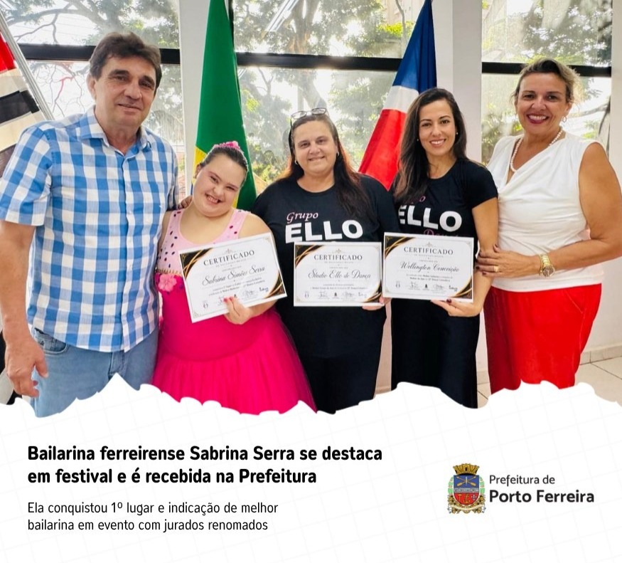 O prefeito André Braga e a vereadora Renata Braga (PL) receberam, na Prefeitura de Porto Ferreira, nesta quarta-feira (29), a bailarina Sabrina Serra, acompanhada das professoras Gisele Pissinatti e Juliana Rosa, do Studio Ello de Dança. O encontro marcou o reconhecimento pelo desempenho da artista no 22º Dança Catanduva, considerado um dos principais festivais do segmento no país.