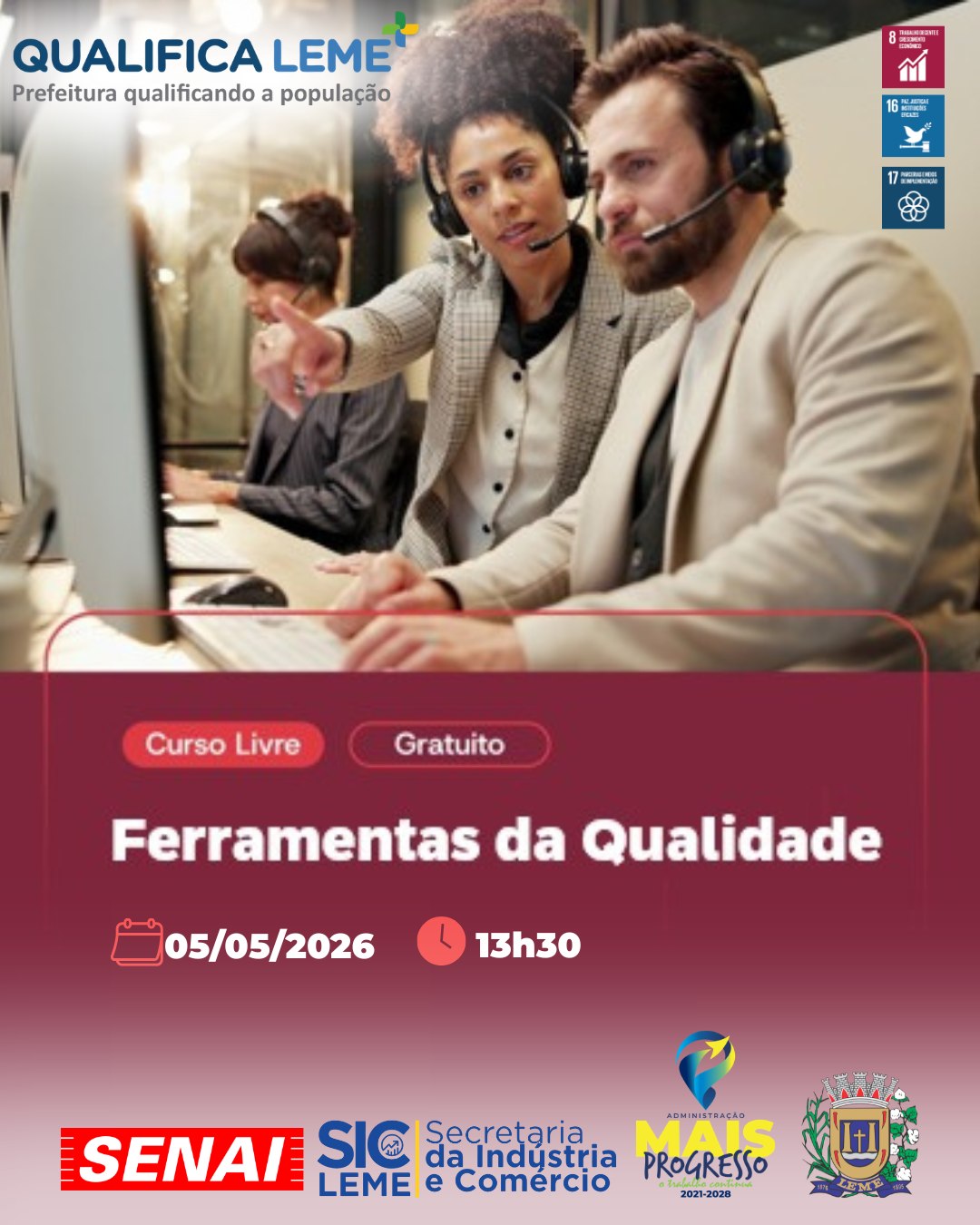 A Prefeitura de Leme está com inscrições abertas para o curso gratuito de Ferramentas da Qualidade, com carga horária total de 36 horas. A formação tem início previsto para o dia 5 de maio de 2026 e segue até 25 de maio.
