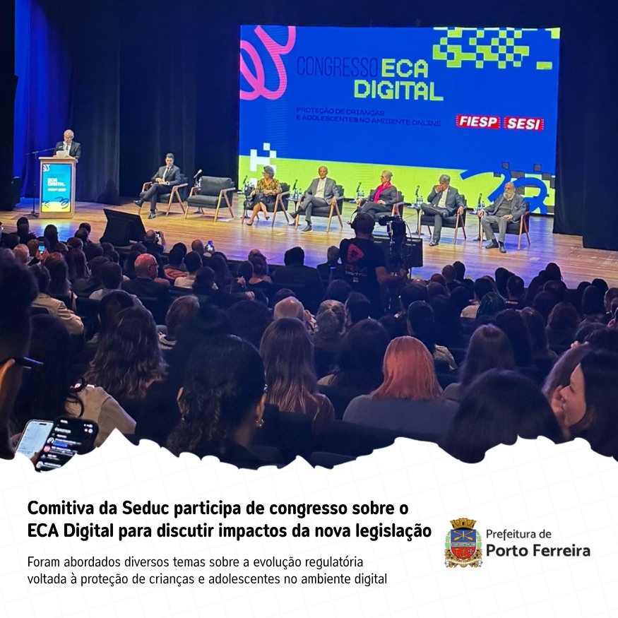 Três representantes da Secretaria Municipal de Educação de Porto Ferreira participaram, na manhã de terça-feira (28), do Congresso ECA Digital, realizado na sede da Fiesp, na capital paulista. O encontro reuniu autoridades, especialistas e representantes de diversos setores para discutir os impactos das novas regulamentações voltadas à proteção de crianças e adolescentes no ambiente digital.