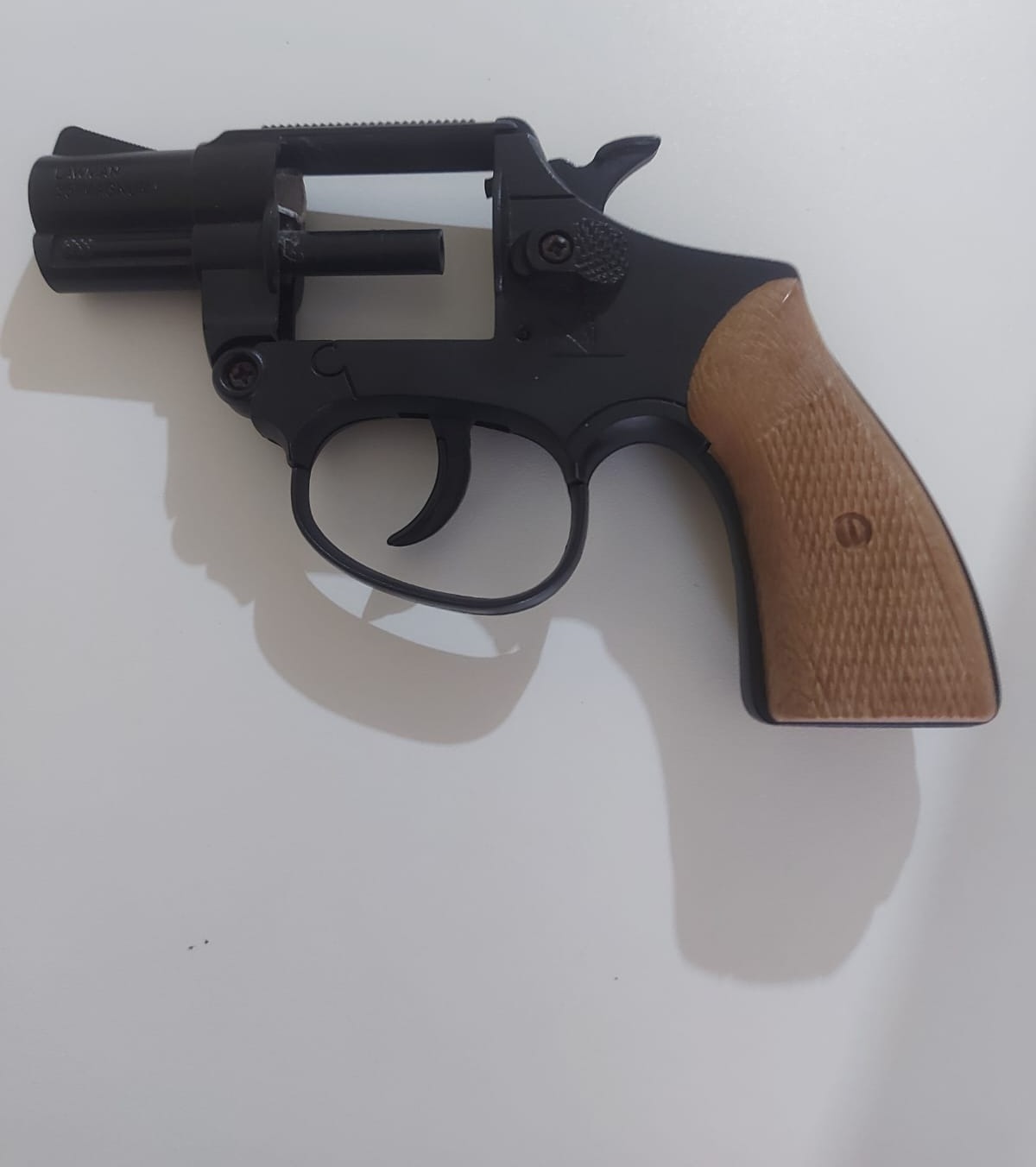 Durante a abordagem, foi feita revista pessoal e os agentes encontraram na cintura do suspeito um objeto semelhante a um revólver. Após verificação, constatou-se que se tratava de um simulacro. Questionado, o homem afirmou que havia encontrado o item.