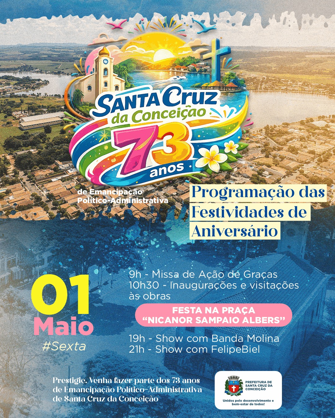 A sexta-feira, 1º de maio, será de celebração em Santa Cruz da Conceição, que comemora seus 73 anos de história com uma programação especial preparada para reunir moradores e visitantes ao longo do dia.