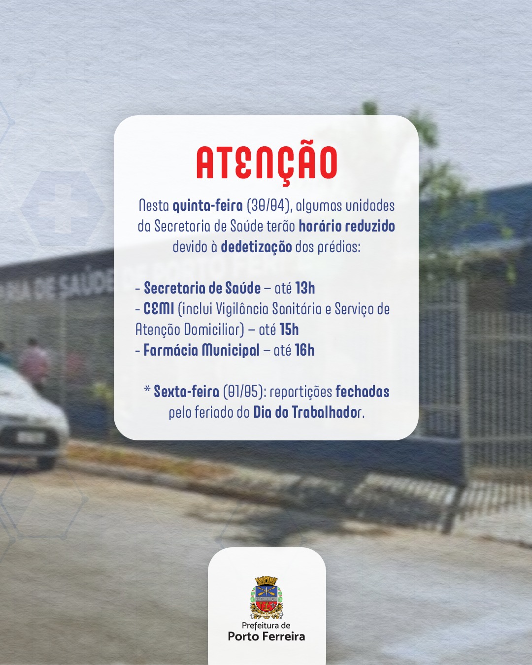 Algumas unidades ligadas à Secretaria de Saúde de Porto Ferreira terão funcionamento em horário reduzido nesta quinta-feira (30). A medida ocorre devido à realização de serviços de dedetização nos prédios.