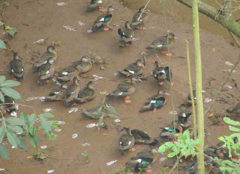 Um bando de marrecos selvagens estava embaixo do Minhocão (Viaduto Tancredo Neves), praticamente imóvel, às margens do Córrego Santa Rosa, e encoberto pela folhagem.