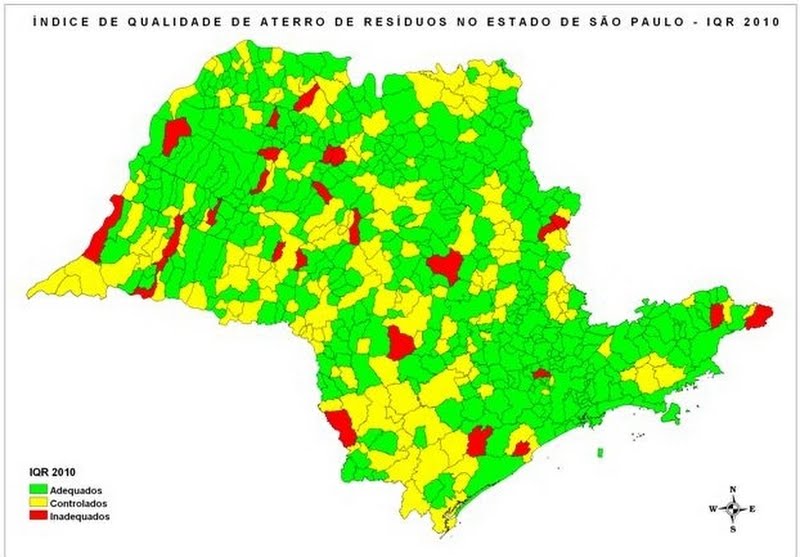 O panorama geral do Estado é apresentado no Mapa de Índice de Qualidade de Aterro de Resíduos – IQR – de 2010, veja também, para efeito de comparação, o Mapa de 1997. A cor verde indica os municípios com disposição final adequada de lixo e a amarela, aqueles municípios em condições enquadradas como controladas. No mapa de 2010, as duas cores predominam e se dividem em áreas mais ou menos equivalentes, por todo o Estado, englobando a maioria dos 645 municípios paulistas.