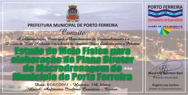 A administração municipal de Porto Ferreira, o Departamento de Desenvolvimento e a Divisão de Meio Ambiente, convidam a população de Porto Ferreira para a palestra “Estudo do Meio Físico Para Elaboração do Plano Diretor de Macrodrenagem do Município de Porto Ferreira”.