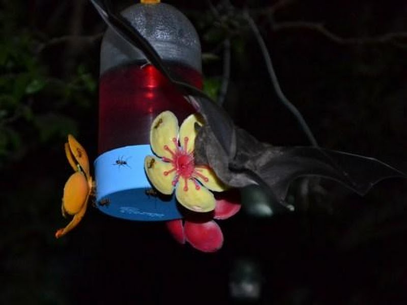 Apesar da rapidez do vôo destes animais, um internauta de Porto Ferreira, conseguiu registrar várias imagens de morcegos se aproximando de um alimentador de beija-flores, durante a noite.