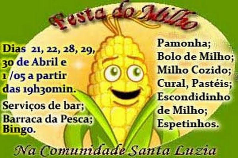 Hoje, 1º de maio, é o último dia da Festa do Milho da Comunidade de Santa Luzia da Paróquia Nossa Senhora Aparecida. A festa está sendo realizada na Praça Olívio Ferrari, bairro Alto do Serra D’Água, com início previsto às 19h30.