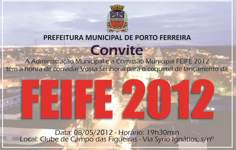A Organização da Feife 2012, através da Administração Municipal, prefeito Dr. Maurício Rasi e da Comissão Oficial da Feife 2012, presidida por Marco Riolino – Diretor do Departamento de Cultura e Turismo, promove nesta terça-feira, dia 07 de maio, o coquetel de lançamento oficial da Feife 2012.