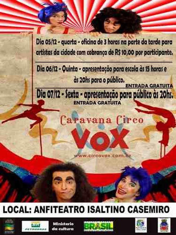 A Caravana Circo Vox passa por Porto Ferreira nos próximos três dias, com programação para artistas da cidade, apresentações para escolas e público. As atividades acontecem no Anfiteatro Isaltino Casemiro (Centro Cultural Fepasa).
