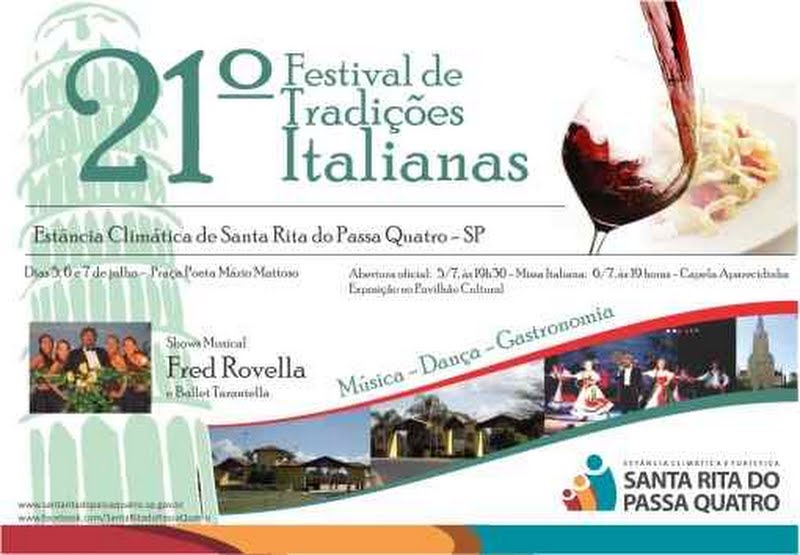 Clima perfeito para o melhor da gastronomia típica e o resgate da cultura italiana em Santa Rita do Passa Quatro, que neste fim de semana recebe o 21º Festival de Tradições Italianas. O evento acontece desta sexta-feira, dia 5, à domingo, dia 7, na Praça Poeta Mário Mattoso, com entrada gratuita.