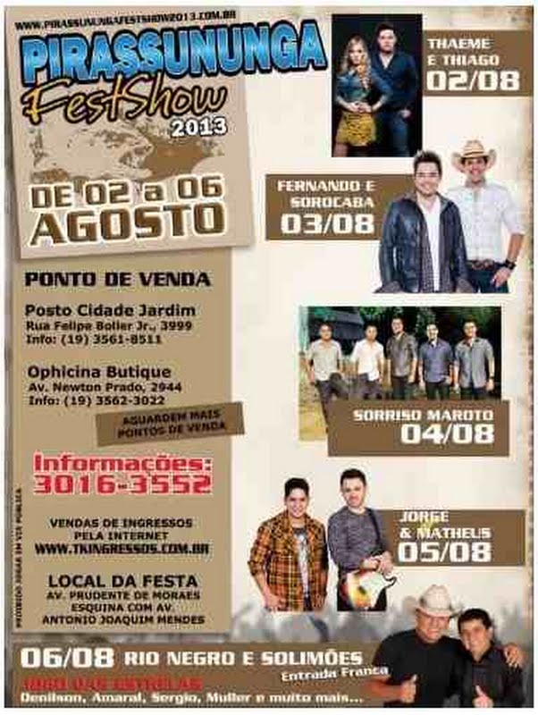 Os empresários Odair Zanetti, Dagoberto Pereira Lima e Jucelin Almeida farão acontecer a festa de aniversário de Pirassununga de dois a seis de agosto é a FestShow 2013, que foi oficialmente lançada na noite de quarta-feira, 10, nas dependências do Centro de Convenções Professor Dr. Fausto Victorelli.