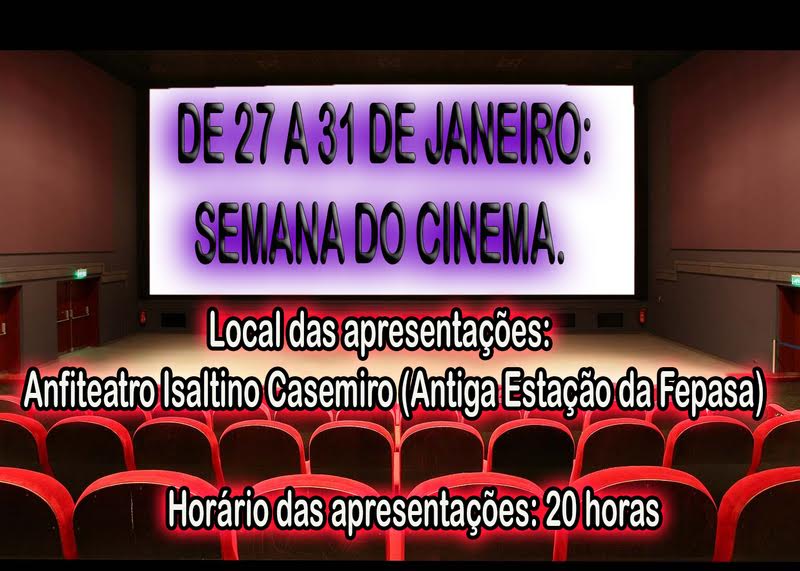 Durante esta semana serão exibidos filmes com classificações diversas no Anfiteatro Isaltino Casemiro, sempre a partir das 20 horas.