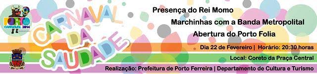 O Departamento de Cultura e Turismo da Prefeitura de Porto Ferreira abre o Porto Folia 2014 com o tradicional Carnaval da Saudade, neste sábado (22/02), a partir das 20h30 horas. O palco da festa será o coreto da praça Cornélio Procópio (central), com a participação do Rei Momo e Rainha. A Banda Metropolital anima a festa com as marchinhas que marcaram época.