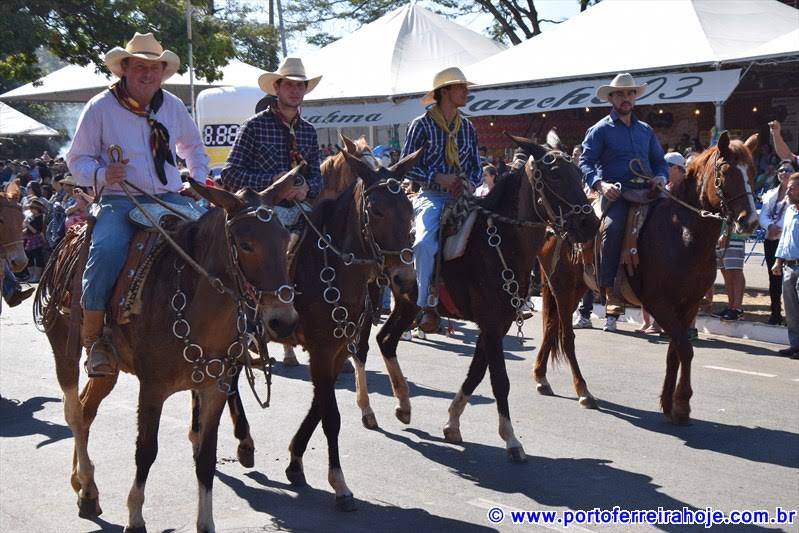 O tradicional desfile de comitivas, cavaleiros, muladeiros, charreteiros e boiadeiros foi a atração especial do domingo (13), no Centro Cultural de Eventos Dona Belila.