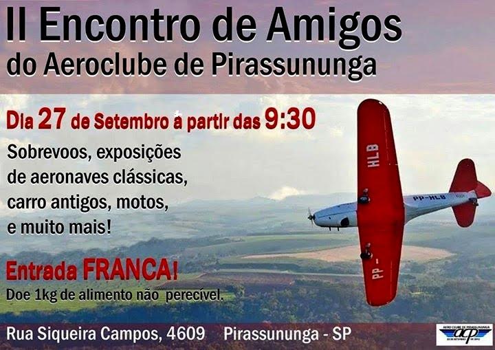 O Aeroclube de Pirassununga promoverá no próximo sábado (27/09) a segunda edição do Encontro de Amigos, por ocasião da comemoração de seus 72 anos. A entrada é franca, porém a organização solicita a doação de 1 kg de alimento não perecível.