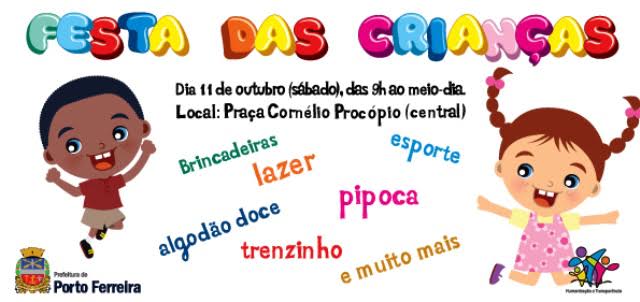A Prefeitura de Porto Ferreira realiza na manhã deste sábado (11/10), das 9 horas ao meio-dia, na praça Cornélio Procópio (central), a Festa das Crianças.