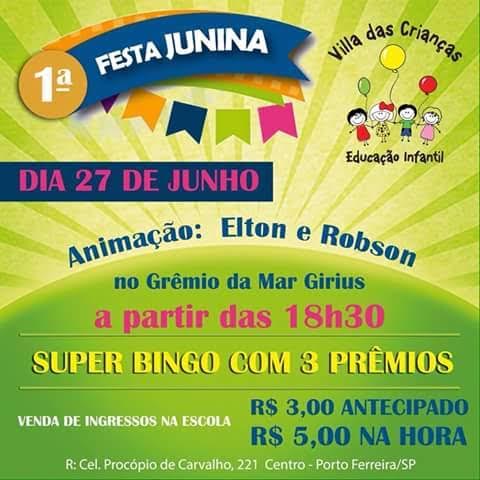 A Villa das Crianças Educação Infantil promove a sua 1ª Festa Junina no sábado, 27 de Junho de 2015, no Grêmio da MarGirius, a partir das 18:30, com animação da dupla Elton e Robson. Haverá Bingo com vários prêmios.