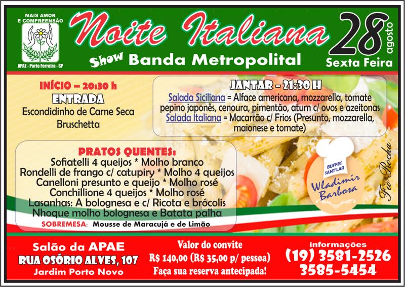 A APAE – Associação de Pais e Amigos dos Excepcionais de Porto Ferreira realizará no dia 28 de agosto, sexta feira, a partir das 20h30 mais uma edição da Noite Italiana.