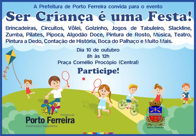 A Prefeitura de Porto Ferreira realiza neste sábado (10/10), das 8h ao meio-dia, na praça Cornélio Procópio (central), o evento “Ser Criança é uma Festa!”, que visa comemorar o Dia das Crianças.