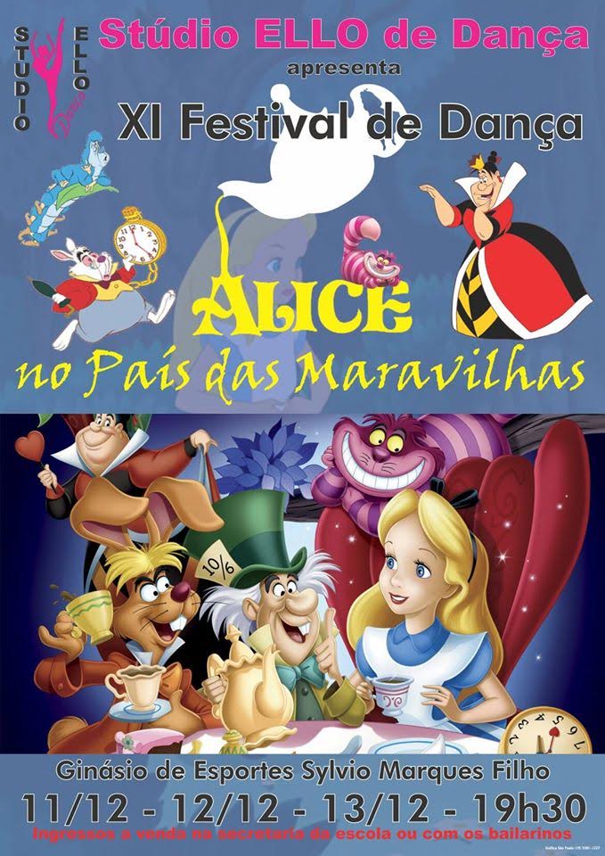 Nos dias 11, 12 e 13 de dezembro o Stúdio ELLO de Dança realiza seu XI Festival de Dança. O tema escolhido para a edição 2015 é "Alice no País das Maravilhas". As três apresentações acontecem às 19h30 no Ginásio de Esportes Sylvio Marques Filho (ao lado da Emef Professora Noráide Mariano), no Jardim Primavera
