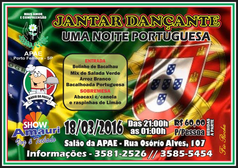 A APAE (Associação de Pais e Amigos dos Excepcionais de Porto Ferreira) promoverá no dia 18 de março o tradicional Jantar Dançante com o tema "Uma Noite Portuguesa", com início às 21 horas.