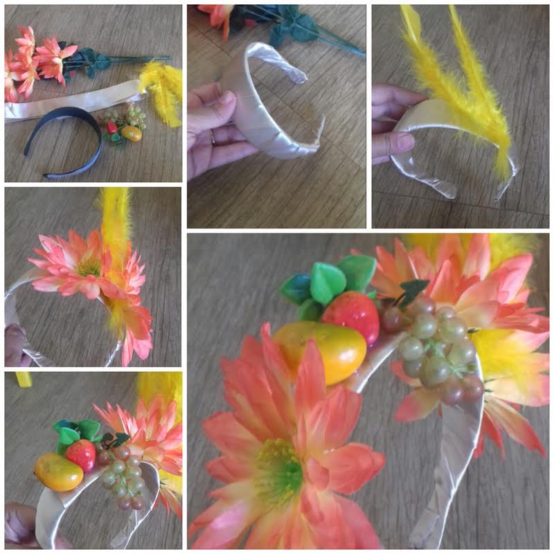 Montagem: revestir a tiara com a fita de cetim e utilizando a cola iniciar a colagem das penas, das flores e por último as frutas. O acessório fica bonito, divertido e não sai por mais de R$15.
