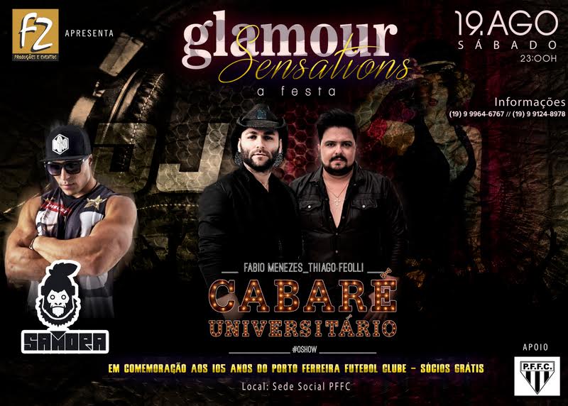 Glamour Sensations a Festa – Cabaré Universitário, dia 19 de Agosto de 2017, a partir das 23h00, na sede social do Porto Ferreira F.C.