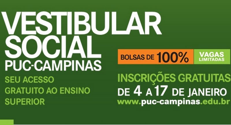 A PUCCAMP – (Pontifícia Universidade Católica de Campinas) recebe inscrições até 17 de janeiro para o Vestibular Social 2011. As inscrições são gratuitas e devem ser feitas pelo site: