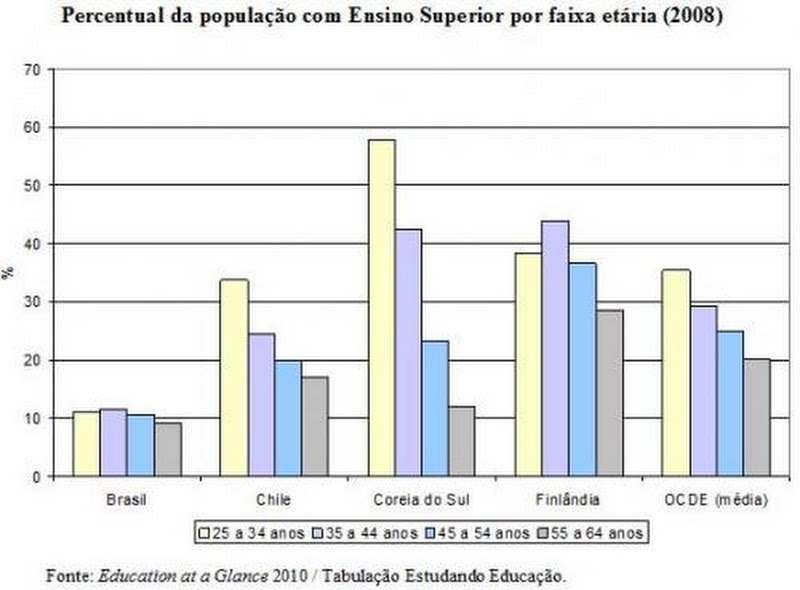 Os números da OCDE se referem a 2008 e indicam que apenas 11% dos brasileiros nessa faixa etária têm diploma universitário. Entre os países da OCDE, a média (28%) é mais do que o dobro da brasileira. O Chile, por exemplo, tem 24%, e a Rússia, 54%. O secretário de Ensino Superior do Ministério da Educação (MEC), Luiz Cláudio Costa, disse que já houve uma evolução dessa taxa desde 2008 e destacou que o número anual de formandos triplicou no país na ultima década.
