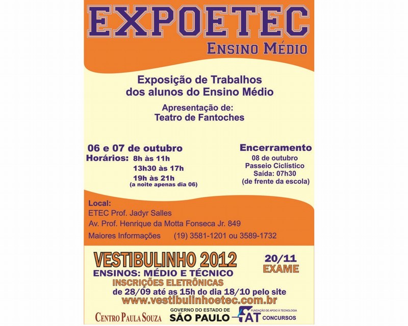 A Prof. Jadyr Salles estará organizando nos dia 06 e 07 de outubro a EXPOETEC do Ensino, com as Exposição dos Trabalhos dos alunos do Ensino Médio da unidade do Centro Paula Souza. Durante a exposição teremos o Teatro de Fantoches.